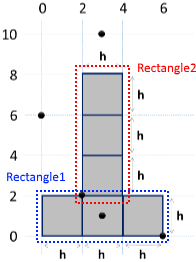 The figure consists of 6 blocks with size h * h, placed as in the figure below. The lower left angle of the building is on position {0, 0}. The upper right angle of the figure is on position {2*h, 4*h}. The coordinates given in the figure are for h = 2: